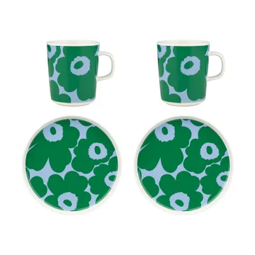 Il Set colazione Unikko del marchio finlandese Marimekko è composto da due tazze e due piattini in gres con il famoso motivo Unikko disegnato da Maija Isola negli anni '60. La forma delle tazze e dei piattini è stata invece realizzata da Sami Ruotsalainen. Il set floreale è perfetto sia per una pausa caffè con gli amici che per la colazione in famiglia.